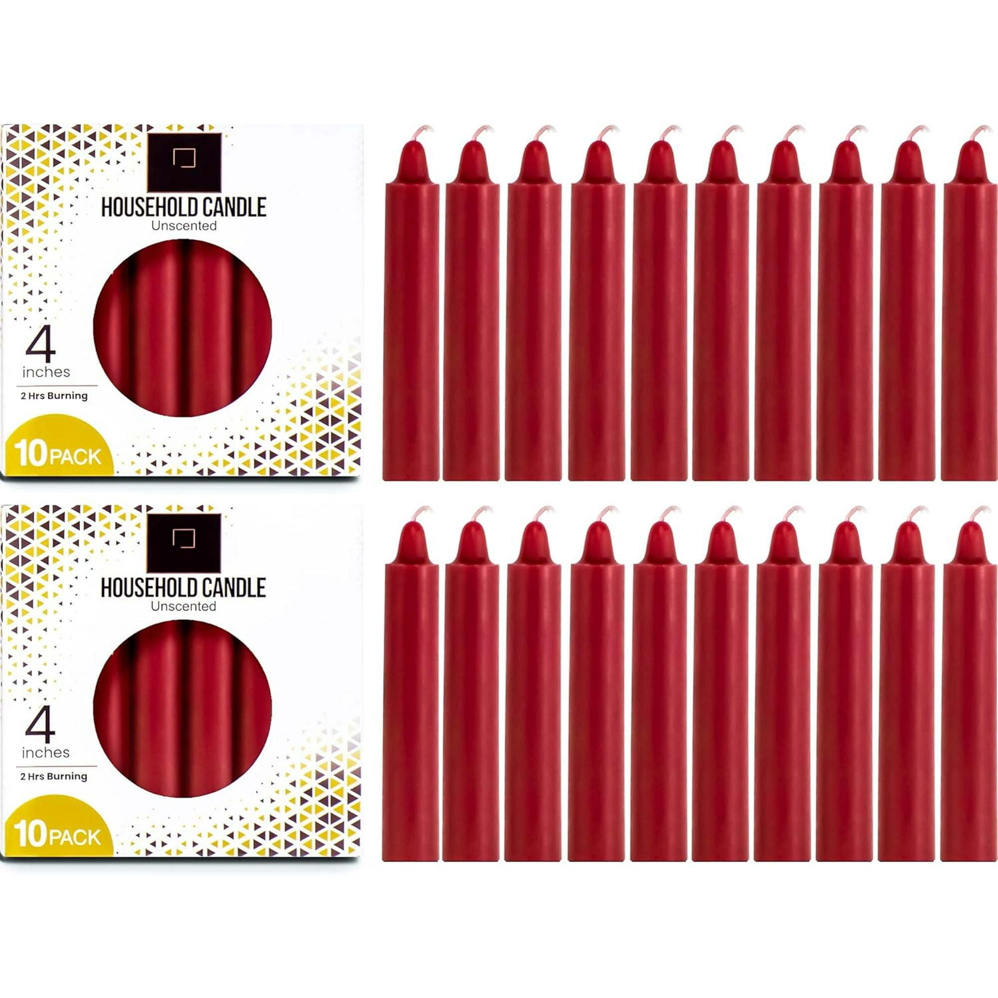 DecorRack 20 Pack Unscented Red Mini Taper Candles. 4 inch Tall w/ 0.5 inch Diameter. Ideal for Chime Casting, Spells, Rituals, Witchcraft, and Meditation. Premium Candles are made with 100% High Quality Paraffin Wax and Braided Cotton Wicks to Ensure Long Lasting Clean Burn. These Candles are Unscented so you can Enjoy your Peace and Tranquility without any Distractions. Can be used to Decorate your Spiritual Space, also Great for Prayer, Vigils, and Memorials.