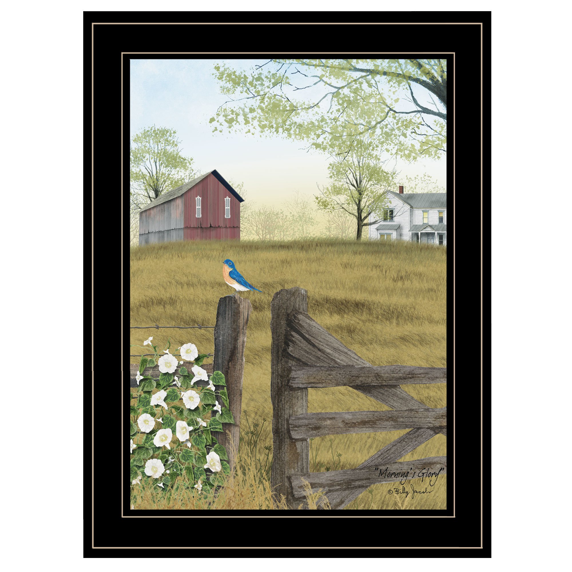 "Morning's Glory" by artist Billy Jacobs, in a stylish 15" x 19" black frame. This art features a pastoral theme with a barn, farmhouse, and an old wooden fence in the foreground. An eastern bluebird perches on top the fence post with morning glories growing on the fence below. Crafted By Skilled American Crafters And Coated With A Fade-resistant Texture, This Piece Has A Canvas-like Appearance That Will Last For Years To Come. Invest In A Piece That Is Truly One-of-a-kind.•Transform your walls with this stunning piece of art and bring a touch of modern elegance to your room. This stunning piece will not only add visual interest to any room but it's minimalist design will bring a sense of serenity to your space.•Tired of dull, empty walls in your home? We believe that walls should inspire, not bore. That's why we offer a wide range of wall art to suit any space from bedroom and kitchens to office and beyond. Give your walls a facelift with our printed arts and transform your space into a stylish and inviting home.•This framed wall art is hand-crafted in the USA of high-quality wood with the surface of the art coated with a fade-resistant texture which gives it a canvas-like appearance for many years of enjoyment in your home.•Bring a pop of colour and style to any room with our fully assembled and ready-to-hang wall art. With a wide selection of decorative pieces to choose from, you'll easily find the perfect match for your personal taste or to give as a thoughtful gift. Don't miss out on the opportunity to add some unique charm to your space.•Experience the unmatched quality and durability of American-made craftsmanship with this individually hand-crafted wall decoration art. Skilled crafters put their expertise into every piece to ensure it will stand test of time and bless your eyes for years to come.